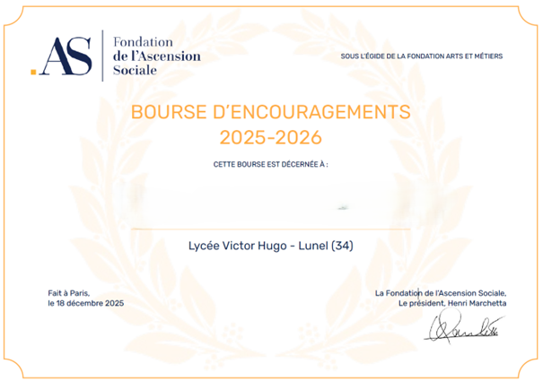Dans le cadre d’une convention signée entre la Fondation de l’Ascension Sociale et le lycée Victor Hugo, pour la première année un lycéen se voit attribuer une bourse au mérite pour l’accompagner dans ces études supérieures durant 6 ans.